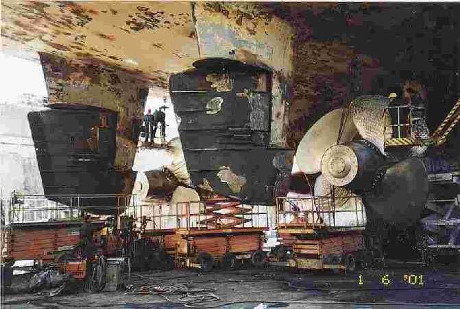 The old rudders and the propellers seen during the docking in Vuosaari in 2001. Photo: Perrti Raasu