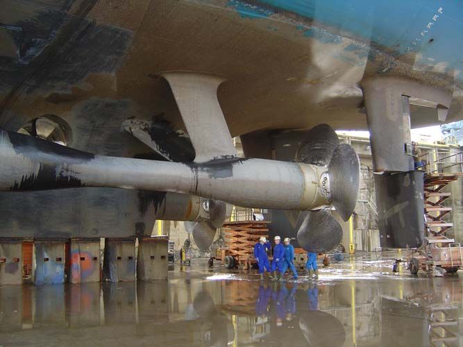 Finnjet's propellers and rudders as seen in Rauma's Finnyards drydock. Photo: Jani Ahvenainen
